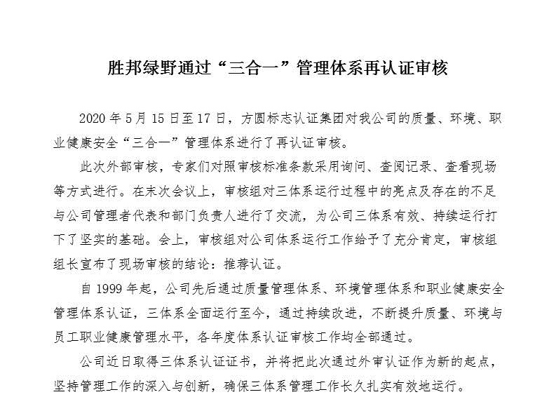 胜邦绿野通过“三合一”管理体系再认证审核