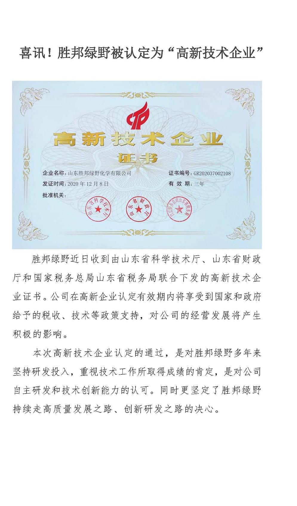 喜讯!胜邦绿野被认定为“高新技术企业”