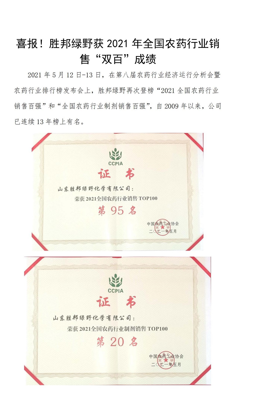 喜报!胜邦绿野获2021年全国农药行业销售“双百”成绩